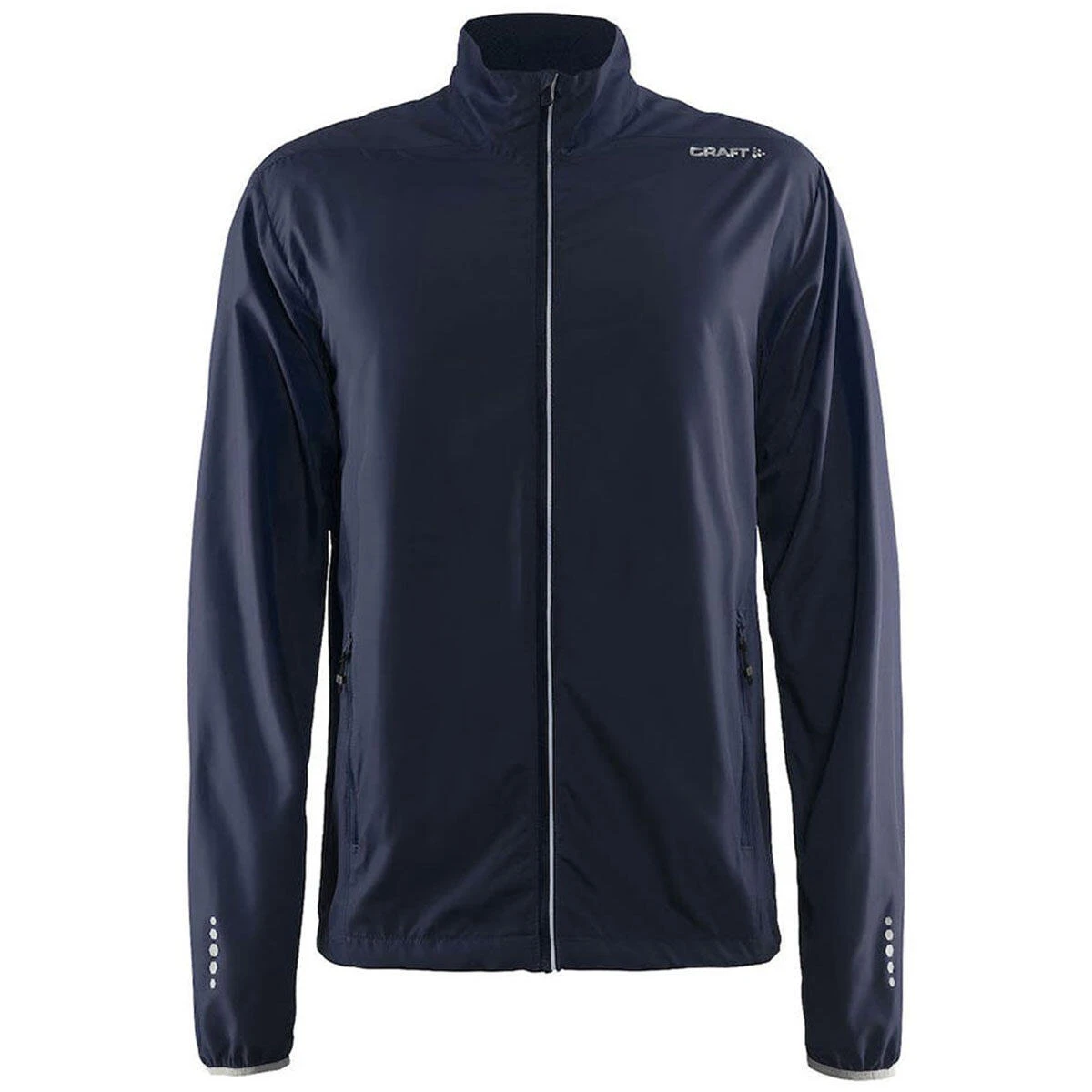 - Lightweight and wind protective running jacket with two zippered pockets and reflective details for enhanced visibility.