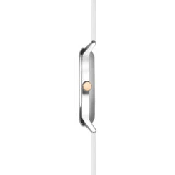 This ladies smart watch fastens with a white silicone strap. With a water resistance rating of IP67 and lots of fitness, social and entertainment features and more, the smart watch has a silver coloured case with a 1.1 inch round interactive dial.