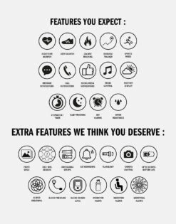 CUSTOMISABLE DISPLAY – choose your watch dial style on the home screen by pressing and holding the middle of the screen. Over 100 dial designs can be downloaded on the app, with the option to add a photo to the dial. EXTRA FEATURES – Heart rate & body temperature tracking, 9 default languages, do not disturb mode, countdown and stopwatch timer, drink water reminder, menstrual alerts and remote photo taking