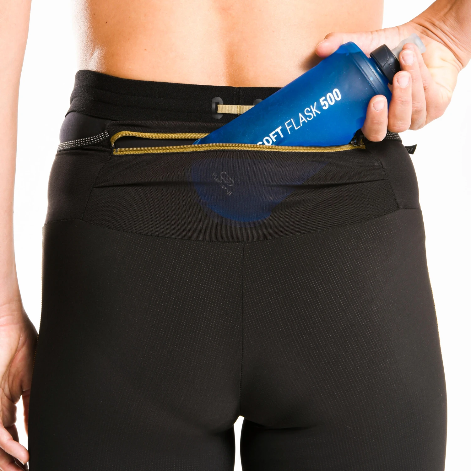 A BUILT-IN WAISTBAND WITH POCKETS for carrying muesli bars, gels, water bottle, keys: